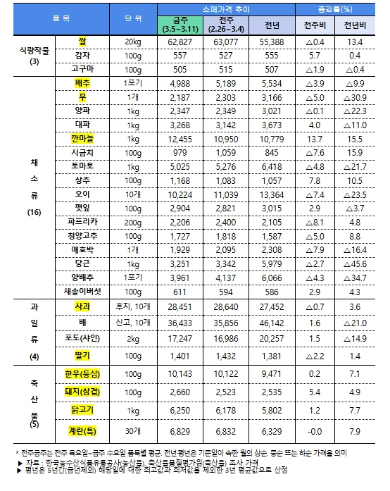 | ▲ 주요 농축산물(28개 품목) 소비자가격 동향(3.13일 기준) |