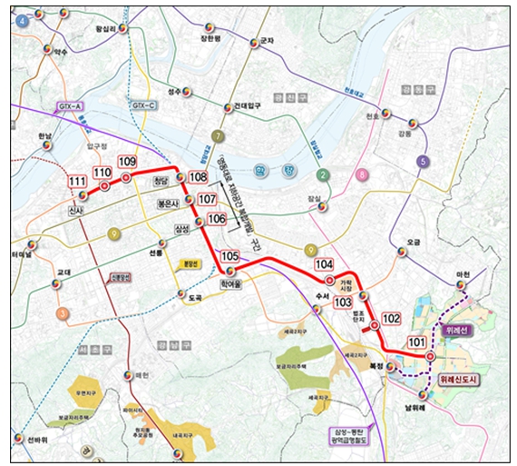 ▲ 노선도( ※ 정거장 위치 등은 개략적인 것이며 향후 사업계획 수립, 공사 단계 등에서 조정될 수 있음)
