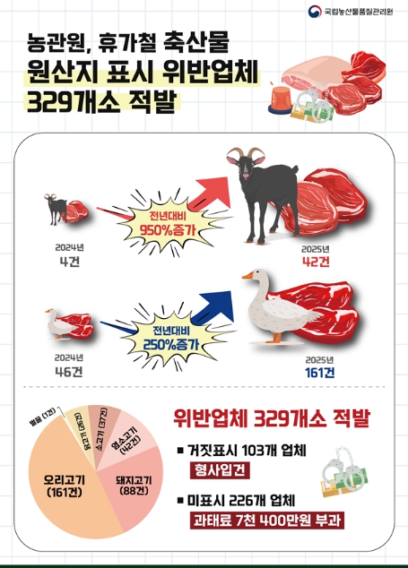 점검 결과 위반업체는 329개소를 적발했으며, 위반품목은 오리고기 161건(45.4%), 돼지고기 88건(24.8%), 염소고기 42건(11.8%), 소고기 37건(10.4%), 닭고기 26건(7.3%), 벌꿀 1건(0.3%) 순으로 나타났다.