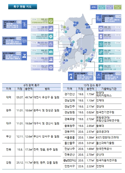 연구개발특구(이하 ‘특구’)는 지역의 산학연 연구개발을 촉진하고, 상호 협력을 활성화하며, 연구개발 성과의 상업화·창업을 지원하는 핵심 거점으로, 현재 대덕을 비롯한 광주, 대구, 부산, 전북, 강원 등 6개의 광역특구와 기술 핵심 기관 중심의 소규모·고밀도 혁신 산학 협력지구(클러스터)인 13개의 강소 특구가 지정되어 있다.
