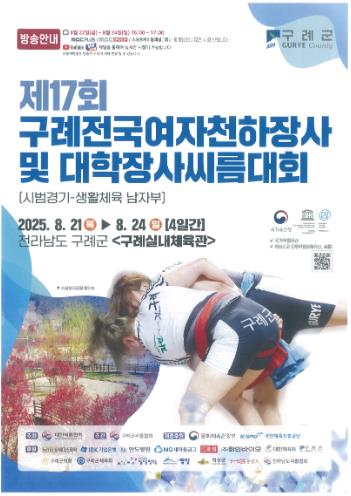 [뉴스힘=주신락 기자] 전남 구례군은 오는 8월 21일부터 24일까지 4일간 구례실내체육관에서 ‘제17회 구례전국여자천하장사 및 대학장사씨름대회’를 개최한다.