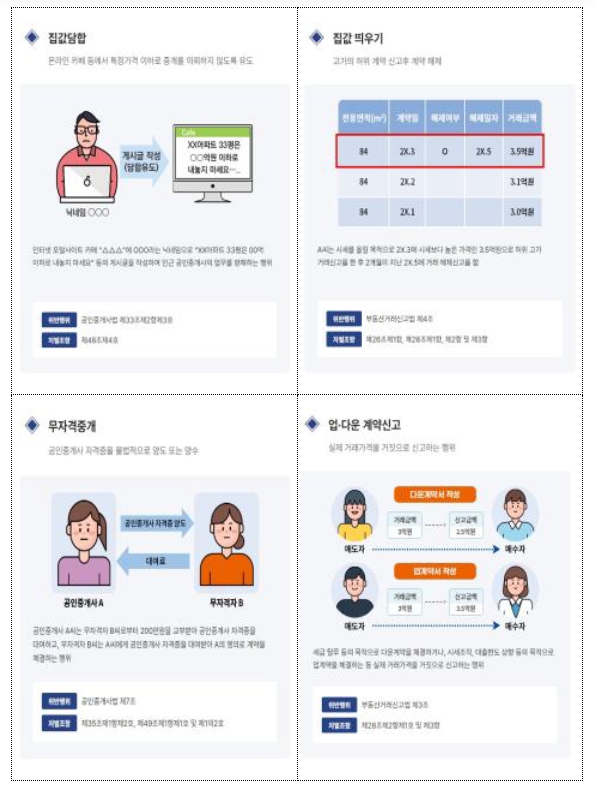 국토교통부는 집값담합, 시세교란(집값 띄우기 등) 및 인터넷 중개대상물 불법 표시·광고 등 부동산거래질서교란행위 전반에 대해 ‘부동산 불법행위 통합 신고센터’를 통해 접수 받고 있으며, 신고된 사례에 대해서는 지자체 등과 협력해 엄정 대응해 나갈 계획이다.