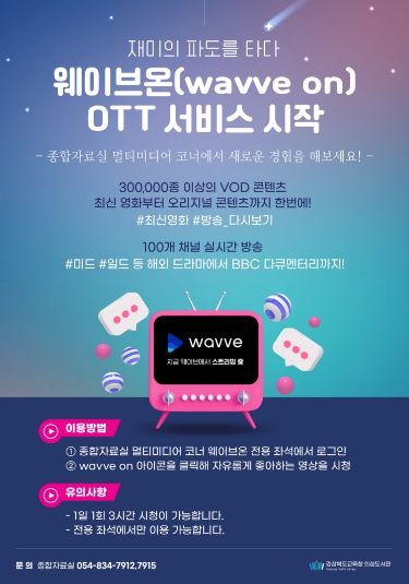 [뉴스힘=박노신 기자] 경상북도교육청 의성도서관(관장 이미경)은 오는 13일부터이용자가 필요로 하는 영상을 실시간으로 제공하는 ‘웨이브온 VOD(Video On Demand)’ 서비스를 운영한다고 밝혔다.
