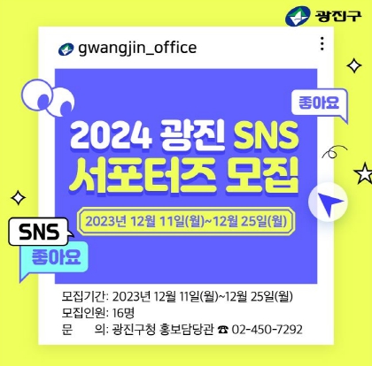 [뉴스힘=박노신 기자] 광진구가 활발한 소통으로 구정 소식을 전달할 ‘2024년 광진 SNS 서포터즈’를 모집한다.