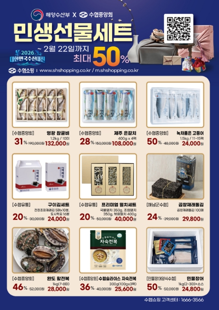 수협 온·오프라인 매장, 모바일 플랫폼(카카오톡 선물하기, 네이버 플러스 스토어)에서 설 기간에 저렴한 가격으로 수산물을 구입할 수 있는 ‘수산물 민생선물세트’도 마련했다. 참조기, 갈치 등 제수용으로 많이 사용되는 품목과 전복 등 소비 촉진이 필요한 품목 위주로 구성했으며, 최대 50% 할인하여 판매할 예정이다.