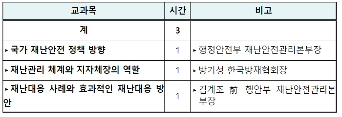 이번 교육은 재난안전과 관련된 법·제도·사례를 포함한 3개 과정으로 구성됐다.