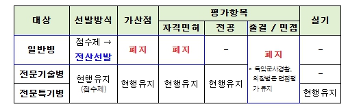 이는 군 복무에 전문성을 요하지 않는 일반병 입대를 위해 불필요한 자격증 취득 등 ‘과도한 스펙 경쟁’으로 이어져 병역이행을 준비하는 청년들의 사회적 ·경제적 비용을 과다 발생시키는 문제점이 있었다. 이를 개선하기 위해 병무청은 국방부 ·공군과 협의를 거쳐 자격 ·면허 ·전공과 상관없이 누구나 지원이 가능한 공군 일반병을 블라인드 방식의 무작위 선발로 변경한다. 다만, 공군 전문기술병과 전문특기병은 군 임무 특수성과 전문성 등을 감안하여 현행대로 점수제 선발 방식을 유지하기로 했다.