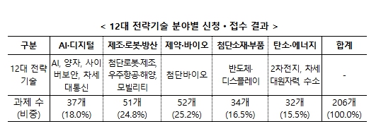 이번 공모는 12대 전략기술 분야를 중심으로 진행된 이번 공모는, 5대 전략기술 그룹 단위로는 제약·바이오 분야에 52개(25.2%), 제조·로봇·방산에 51개(24.8%), 인공지능(이하 AI)·디지털에 37개(18.0%) 등이 접수됐으며, 총 206개 접수 과제에 1,183개 기업·연구소 등이 참여 신청했다.