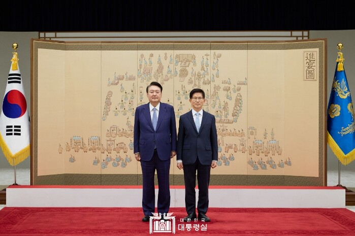 [뉴스힘=박노신 기자] 8월 30일 윤석열 대통령은 용산 대통령실에서 김문수 고용노동부 장관에게 임명장을 수여했다