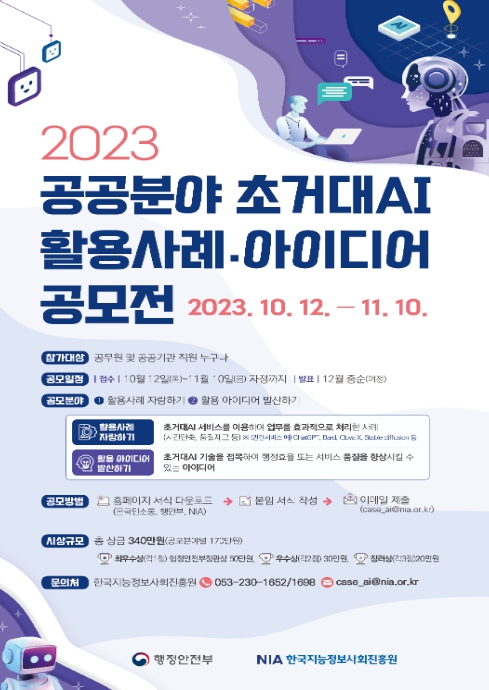 이에, 행정안전부는 공공의 업무추진 과정에서 초거대 인공지능 기술을 활용한 사례와 아이디어를 발굴하고, 확산하기 위해 공모전을 마련했다.