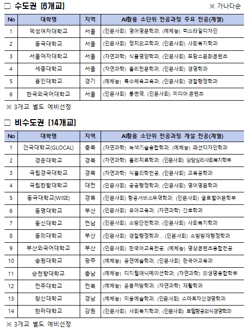 선정 대학은 인공지능(AI)의 윤리적 활용과 비판적 사고 등 인공지능(AI) 전반에 대한 ‘기초 교양 교과’와, 인공지능(AI)을 비공학계열 전공에 활용하는 ‘인공지능(AI) 활용 소단위 전공 과정’을 개발·운영하게 된다. 또한, 학습자에게 양질의 인공지능(AI) 교육을 제공할 수 있도록 교수자 역량 강화와 관리 체계 구축도 병행 추진한다. 개발된 교육과정을 타 대학과 공유하고, 대학 현장 전반에 인공지능(AI) 교육의 확산을 도모한다.