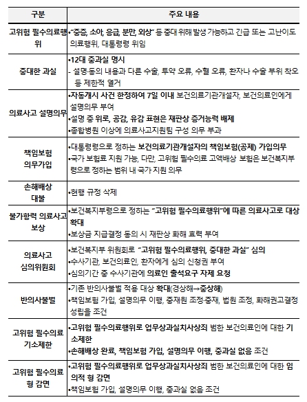 불가항력 의료사고 보상 대상을 기존 분만사고에서 ‘보건복지부령으로 정하는 고위험 필수의료행위’로 확대하여 필수의료에 대한 국가책임을 강화했다. 보상 대상인 고위험 필수의료행위의 범위·유형에 대해서는 의료계, 전문가 등과 논의하여 보건복지부령을 통해 구체화할 예정이다.