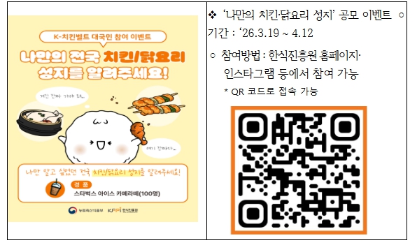 농식품부는 오늘부터 ‘나만의 K-치킨 벨트(성지)’ 대국민 참여 이벤트를 시작한다. 국민 누구나 지역의 숨은 치킨 맛집, 닭요리 특화거리, 관련 역사적 스토리가 있는 장소 등을 추천할 수 있으며, 향후 치킨벨트 조성에 활용할 예정이다.