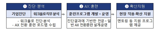 ① 1단계(진단·분석): 전문가가 기업 현장을 방문해 AI도입 준비 수준을 진단하고, 업무 프로세스별 병목 구간을 파악해 ‘AI 훈련 로드맵’을 수립한다.
