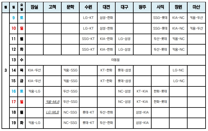 3월 9일(토)부터 19일(화)까지 구단당 10경기, 총 48경기 편성