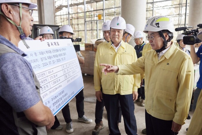 | ▲ 14일 오후 김동연 경기도지사가 의왕시 학의동 건설현장을 방문해 건설업 산업재해 취약요인 점검을 하고 있다. |