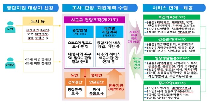 의료·요양·돌봄 통합지원은 노쇠 등으로 일상생활에 어려움을 겪는 사람이 ‘살던 곳에서 건강하고 행복한 생활을 영위’할 수 있도록 시‧군‧구가 중심이 되어 지역서비스를 통합적으로 연계·제공하는 사업이다.