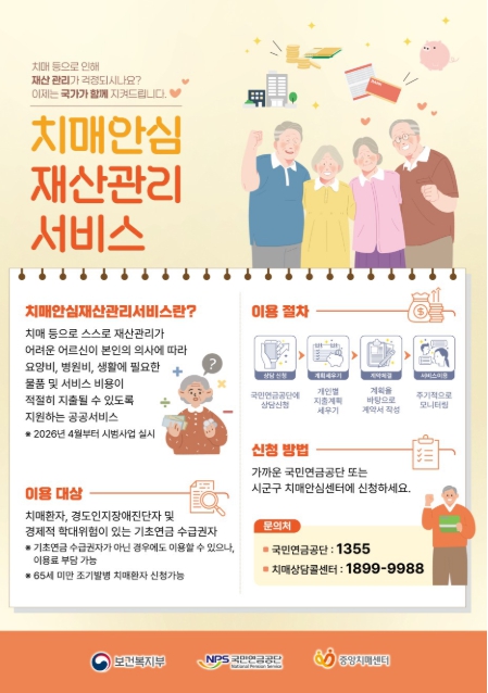 [뉴스힘=박노신 기자] 보건복지부는 4월 22일부터 ‘치매안심재산관리서비스 시범사업’을 실시한다고 밝혔다. 주요 대상은 치매, 경도인지장애 등으로 인해 경제적 학대 위험이 있는 기초연금수급자이며, 국민연금공단 7개 지역본부*에서 상담 받을 수 있다.
