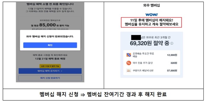 또한, 개인정보위는 쿠팡이 회원탈퇴 절차를 복잡하고, 탈퇴 메뉴를 찾기 어렵게 구성, 운영한 사실을 확인했다. 특히, 유료 서비스인 와우 멤버십에 가입한 회원의 경우 멤버십 해지를 회원탈퇴의 필수 조건으로 운영하면서, 멤버십 해지 절차를 여러 단계 거치게 하고, 해지 의사를 재확인하여, 멤버십을 해지하기 어렵게 운영했다. 또한, 일부 회원에 대하여는 멤버십 잔여 기간이 종료될 때까지 멤버십 해지를 불가능하게 하여, 실질적으로 즉각적인 회원탈퇴를 할 수 없도록 한 사실을 확인했다.