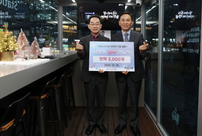 [뉴스힘=박노신 기자] 꿈이 모이는 도시, 미래를 그리는 강남구가 15일 오후 5시 이동노동자 쉼터 2호점에서 순복음강남교회와 함께 ‘사랑의 핫팩 전달식’을 개최했다.