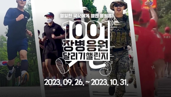 [뉴스힘=박노신 기자] 국방부는 10월 1일 국군의 날을 맞아 국민과 함께하는 누리소통망(SNS) 달리기 챌린지(Challenge) '1001 장병 응원 달리기 챌린지'[부제: 열일(1001)한 국군에게 열(10)띤 응원(01)을!]를 전개한다.
