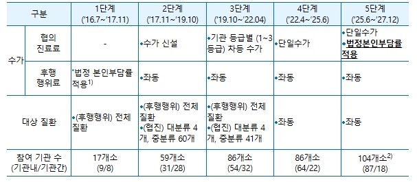 다만, 이번에 실시하는 ‘의·한 협진 5단계 시범사업’ 에서는 시범사업의 본사업 전환 검토를 위한 효과성‧수용성 등 평가를 위해 그간 전액 건강보험재정에서 부담했던 협의진료료(협의 진료에 대해 의과 및 한의과 진료에 각각 산정, 근골격계질환 등 대상)에 대해 법정본인부담률을 적용한다.