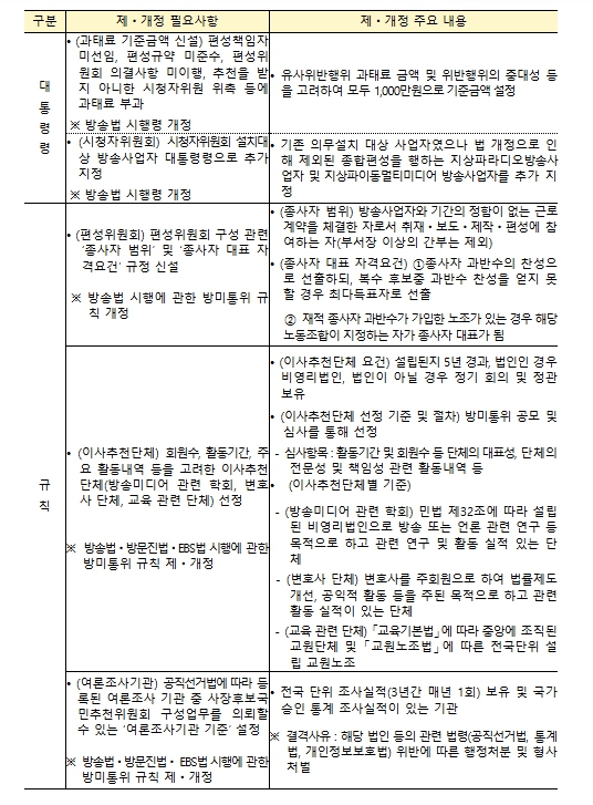 | ▲ ‘방송 3법’ 후속조치 제‧개정안 주요 내용 |