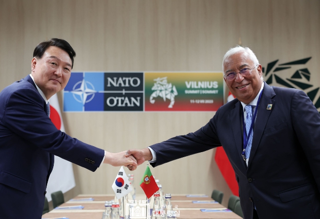 [뉴스힘=박노신 기자] 윤석열 대통령은 북대서양조약기구(NATO) 정상회의 참석 계기에 7월 11일 안토니우 코스타(António Costa) 포르투갈 총리와 약식회담을 갖고, 실질 협력 강화 방안, 국제 정세 동향에 대해 논의했다.