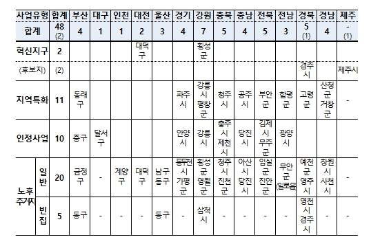 한편, 신규 사업지 48곳 중 43곳(89.6%)이 비수도권, 22곳(45.8%)은 인구 10만명이하 소도시(시·군·구 인구 기준)로 나타나 국가 균형성장에도 기여할 것으로 전망된다.