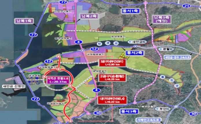 지역간 연결도로는 새만금으로 진입하는 국도 30호선(동서3축)을 시점으로 새만금 내부 중심지역(관광레저・농생명・복합개발)을 관통해 국도 12호선(동서2축)에 연결하는 총연장 20.37km, 왕복 6차로의 새만금 내부 간선축이다.
