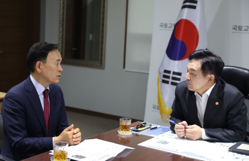 [뉴스힘=박노신 기자] 조성명 강남구청장이 지난 21일 오후 5시 국토발전전시관 회의실에서 원희룡 국토교통부 장관을 만나 강남구 주요 현안 사항을 전달했다.