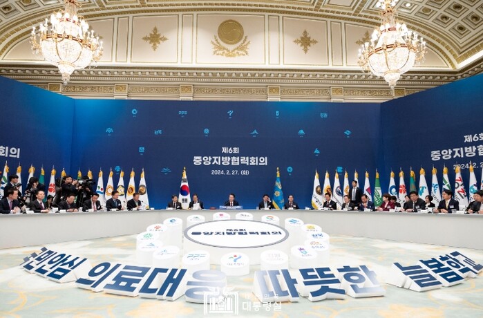[뉴스힘=박노신 기자] 윤석열 대통령은 2월 27일 오후 영빈관에서 제6차 중앙지방협력회의를 주재했다. 이날 회의는 중앙지방협력회의 개최 후 전국 17개 시도지사와 시·도 교육감이 한자리에 모인 첫 사례로, ‘의료 개혁’과 ‘2024년 늘봄학교 준비’ 2가지 안건을 논의했다.