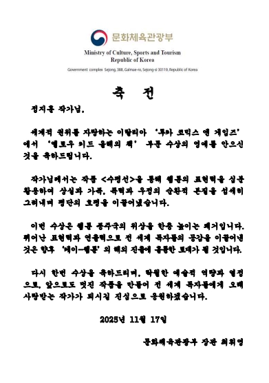 [뉴스힘=박노신 기자] 최휘영 문화체육관광부 장관은 지난 11월 2일에 막을 내린 ‘루카 코믹스 앤 어워즈’에서 웹툰 작품 '수평선'으로 ‘옐로우 키드 올해의 책’ 부문 상을 수상한 정지훈 작가에게 축전을 보내 축하와 격려의 뜻을 전했다.