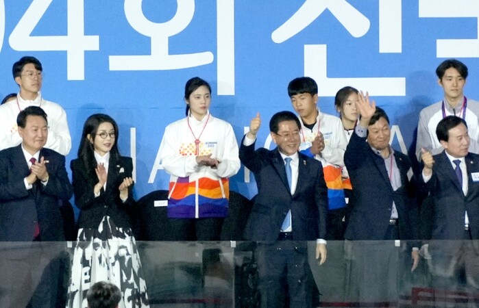 개회식장에 들어선 성화는 경기장 트랙에서 4명의 주자를 거쳐 최종 주자에게 전달됐다. 베일에 가려졌던 최종 주자는 지난해 전국체전 육상 4관왕 배건율이었다. 5명의 주자가 함께 펼친 레이저불꽃쇼 성화 점화 퍼포먼스는 우주 개발의 자존심인 나로호가 발사되고 우주로 비상하는 모습을 형상화한 드론쇼, 폭죽으로 연출돼 관중의 탄성이 이어졌다. 성화 점화를 끝으로 공식행사가 마무리되고, 장민호, 송가인, 박지현, 다이나믹듀오, 에버글로우 등 다채로운 케이팝(K-POP) 공연이 펼쳐졌다.