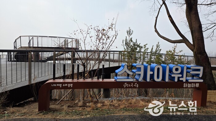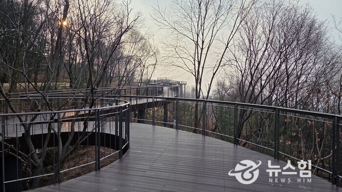 [뉴스힘=박노신 기자] 용마산 스카이워크는 용마산과 망우역사공원의 사이에 위치하고 있다. 지상 최대 10m 높이의 목재 데크 산책로로, 약 160m 구간을 숲 위를 걷는 듯한 느낌으로 조성되었다. 겨울에도 계단에는 논슬립 패드 커버가 설치되어 있어 안전하게 이용할 수 있으며, 조명이 설치되어 이른 아침이나 저녁에 또 다른 볼거리를 제공한다.