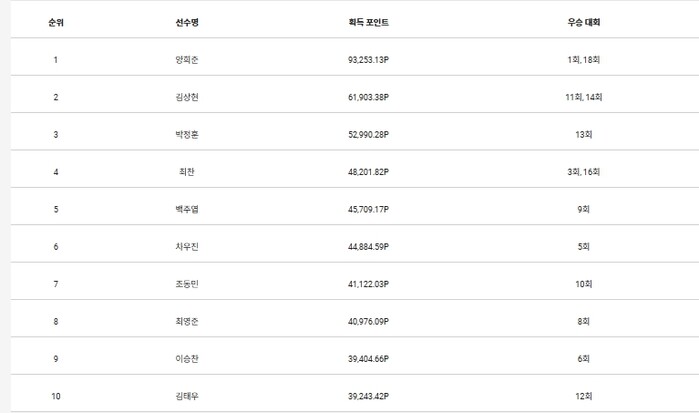 ▲ KPGA 챌린지투어 챔피언십’ 개막 전 통합 포인트 순위 TOP10