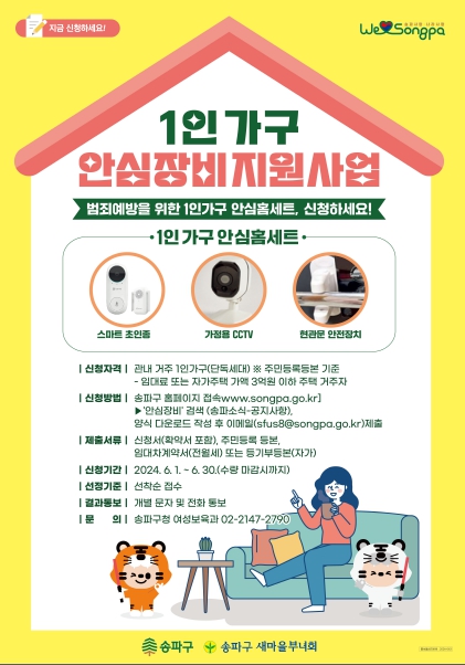 서강석 송파구청장은 “행복한 삶을 위해 안전한 일상은 반드시 보장 받아야 한다”며 “이번 안심장비지원으로 1인가구를 포함한 구민 누구나 송파구에서 안심하고 생활할 수 있는 환경을 조성해 나가겠다”고 전했다.