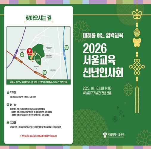 [뉴스힘=박노신 기자] 서울특별시교육청은 오는 1월 13일에 용산구 백범김구기념관 컨벤션홀에서 ‘2026년 서울교육 신년인사회’를 개최한다.