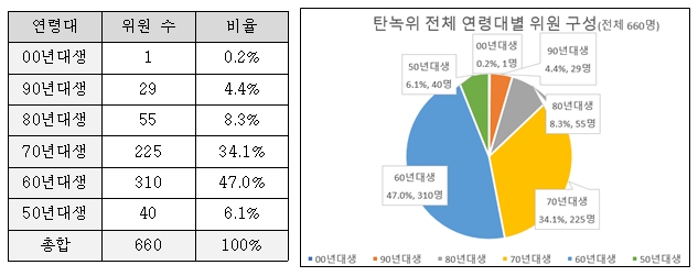 대통령 직속 탄녹위 구성 현황을 살펴보면, 전체 위원 53명 중 50~70년대생은 84.9%(45명)를 차지한다. 50년대생은 9.4%(5명), 60년대생은 45.3%(24명), 70년대생은 30.2%(16명)이다. 반면, 80년대생은 9.4%(5명)이며, 90년대생(25세~35세)은 5.7%(3명)에 불과하다. 청년 위원은 3.8%(2명)이며, 25세 이하인 위원은 없다.