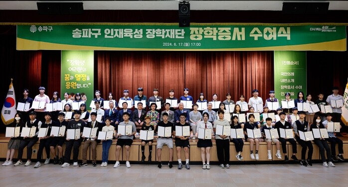 지난 17일 송파구청에서는 이를 축하하기 위한 ‘2024년 상반기 장학증서 수여식’를 개최했다. 장학생과 학부모 등 총 100여 명이 한자리에 모여 장학증서를 전달받고, 서강석 송파구청장과 재단 이사 등 주요 관계자들도 참석해 뜻깊은 날을 기념했다.