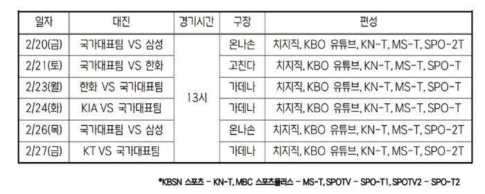 [뉴스힘=박노신 기자] 3월에 열리는 월드베이스볼클래식(이하 WBC)에 대비해 일본 오키나와에 훈련 캠프를 차리는 대한민국 국가대표팀의 평가전 일정과 중계가 확정됐다.