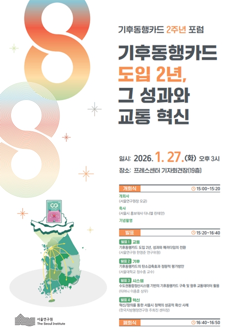 [뉴스힘=박노신 기자] 서울연구원은 오는 27일 오후 3시, 한국프레스센터 기자회견장에서 '기후동행카드 도입 2년, 그 성과와 교통 혁신'을 주제로 기후동행카드 2주년 정책 포럼을 개최한다.