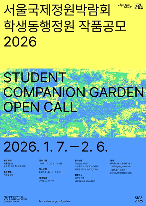서울시는 창의적인 정원 디자인 발굴과 정원문화 확산을 위해 7일부터 2월 6일까지 '2026 서울국제정원박람회' 학생동행정원 및 시민동행정원 작품공모를 진행한다고 밝혔다.