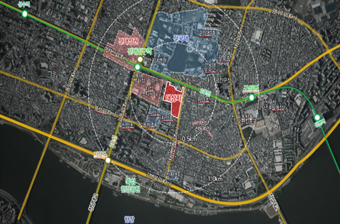 자양동 227-147 일대는 서측으로는 건대입구역이 위치해 대중교통 이용이 편리하고, 도보로 10분이면 한강공원까지 접근할 수 있는 우수한 입지지만 건대 스타시티, 자양동 모아타운, 우성1차 리모델링 단지 사이에서 섬처럼 남아있는 노후불량 주거지다.