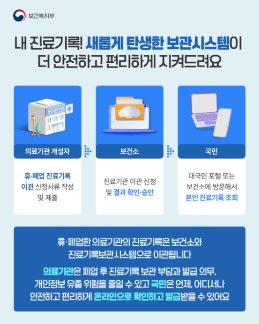 [뉴스힘=박노신 기자] 보건복지부와 한국보건의료정보원은 다니던 병원이 문을 닫아도 국민이 자신의 진료기록을 보다 편하게 확인할 수 있도록 휴·폐업 의료기관 진료기록보관시스템 개선을 추진한다고 밝혔다.