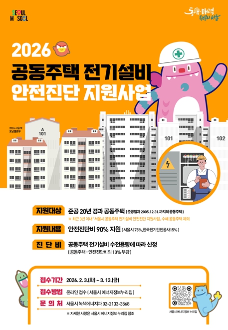 [뉴스힘=박노신 기자] 서울시는 노후 공동주택의 정전사고를 사전에 차단하고, 시민 생활안전을 강화하기 위해 ‘2026년 공동주택 전기설비 안전진단 지원사업’을 추진한다. 한국전기안전공사와 협력해 공동주택 전기설비의 적정 운전·관리 상태를 종합 진단하고, 진단비의 90%를 지원한다.