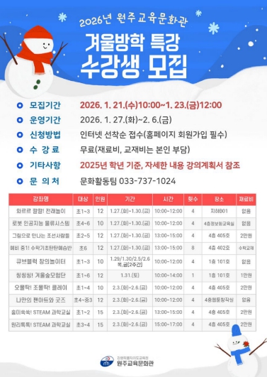 [뉴스힘=박노신 기자] 원주교육문화관(관장 용석태)은 1월 21일부터 23일까지 관내 초·중학생을 대상으로 겨울방학 특강 수강생을 모집한다.