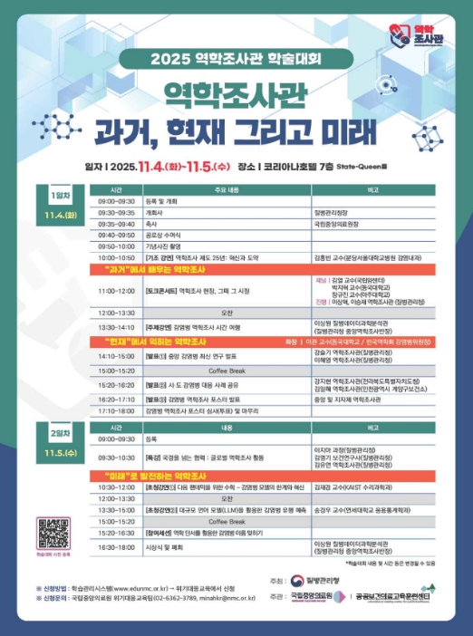 [뉴스힘=박노신 기자] 질병관리청은 11월 4일~5일 양일간 ‘역학조사관 과거, 현재 그리고 미래’를 주제로 '2025년 역학조사관 학술대회'를 개최한다.