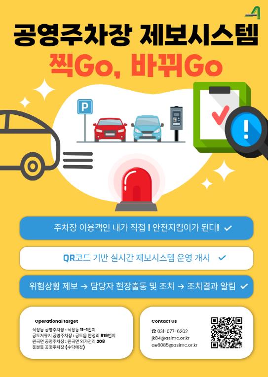 [뉴스힘=박노신 기자] 안성시시설관리공단은 지난 10월 10일부터 원곡면, 석정동, 공도 저류지, 동본동(수탁예정)공영주차장 4개소 대상으로, 이용객이 직접 주차장의 위험요소나 이용 불편사항을 손쉽게 제보하고 개선에 참여할 수 있는 QR 코드 기반의 실시간 위험상황 제보시스템 “찍Go, 바뀌Go”를 운영한다고 밝혔다.