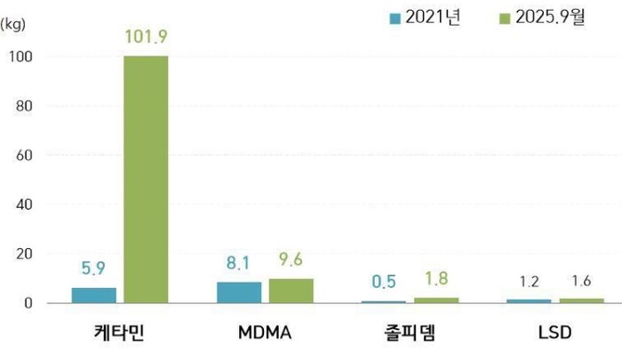 이는 약 232만 명이 동시 투약할 수 있는 양으로, 특히 2025년 1월부터 9월까지의 적발량(115.9kg)이 2024년 전체 적발량(79.9kg)을 초과하여 가파른 증가세를 보이고 있다.